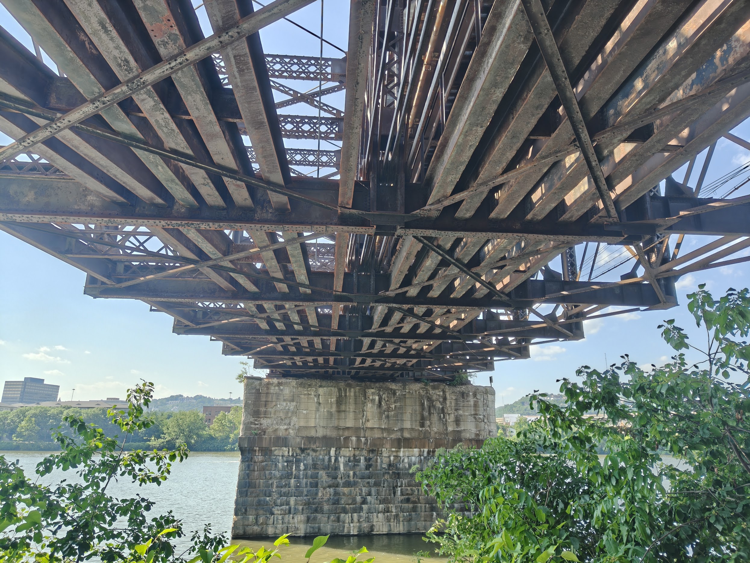 没走多远就看到一座铁路桥(Fort Wayne Railroad Bridge)。下层桥面早在上世纪八十年代配合宾州车站的改造时便已彻底停用,许多当年的钢结构与附属建材也陆续被拆除移走,只留下空荡的桥体骨架。然而上层的铁路线至今仍承担着繁重的货运任务,每当重型货运列车隆隆驶过,整个桥身都会随之震动,连机车发出的低沉鸣笛声也能穿越数个街区,一直传到远处的宾州车站,让人感觉好像回到了重工业时代。建成于1904年的宏伟主跨依然不甘地矗立在河上,高耸的钢铁桁架依旧展示着当年钢铁之城的雄浑气魄,但锈迹斑斑的钢梁与长满苔藓的桥墩却无时无刻不在提醒着过往的行人——那个曾经烟囱林立、钢厂昼夜不息的匹兹堡,早已随着八十年代的去工业化浪潮消失在历史的尘埃之中。