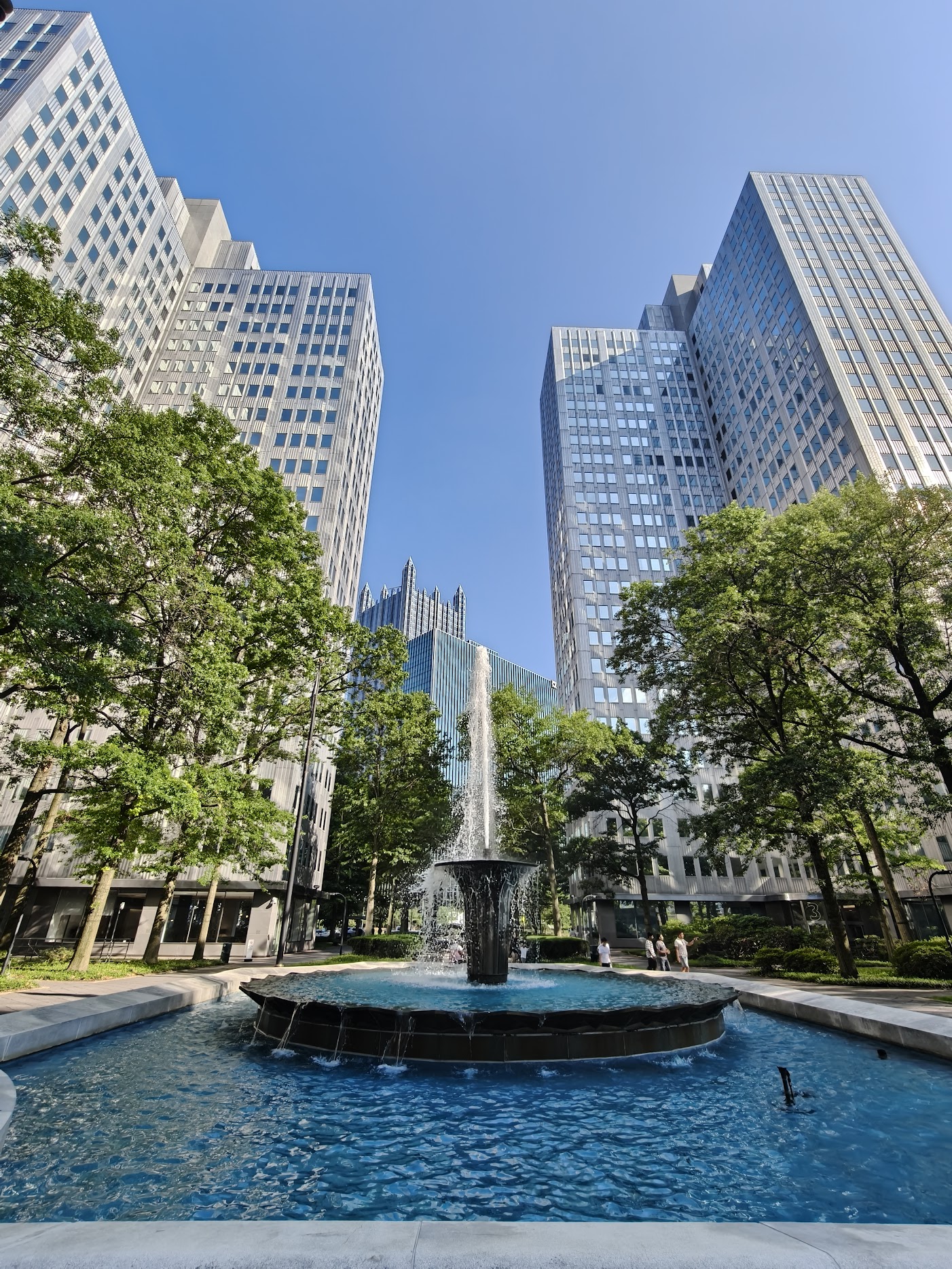 最终我们走到了市中心的核心区,这里终于呈现出大都会应有的面貌,高耸的玻璃幕墙大厦依次排开,其中UPMC医疗中心的塔楼尤为突出,象征着匹兹堡已成功转型为以医疗健康、科技与教育为支柱的现代城市。与匹大和卡内基梅隆大学周边那些低矮的住宅区相比,这里的建筑规模与气派简直有天壤之别。虽然白天市中心的治安状况尚可,但当地朋友多次提醒我入夜后这一带并不安全,因此我们特意选在日落前离开。我们到达时只见几个流浪汉倚靠在银行大厦的墙脚阴凉处,整个街道在炽热阳光下显得异常安静。值得思考的是,即便在铁锈带城市中,匹兹堡的转型成果与治安水平已属上乘,这更凸显了美国后工业城市面临的普遍困境。