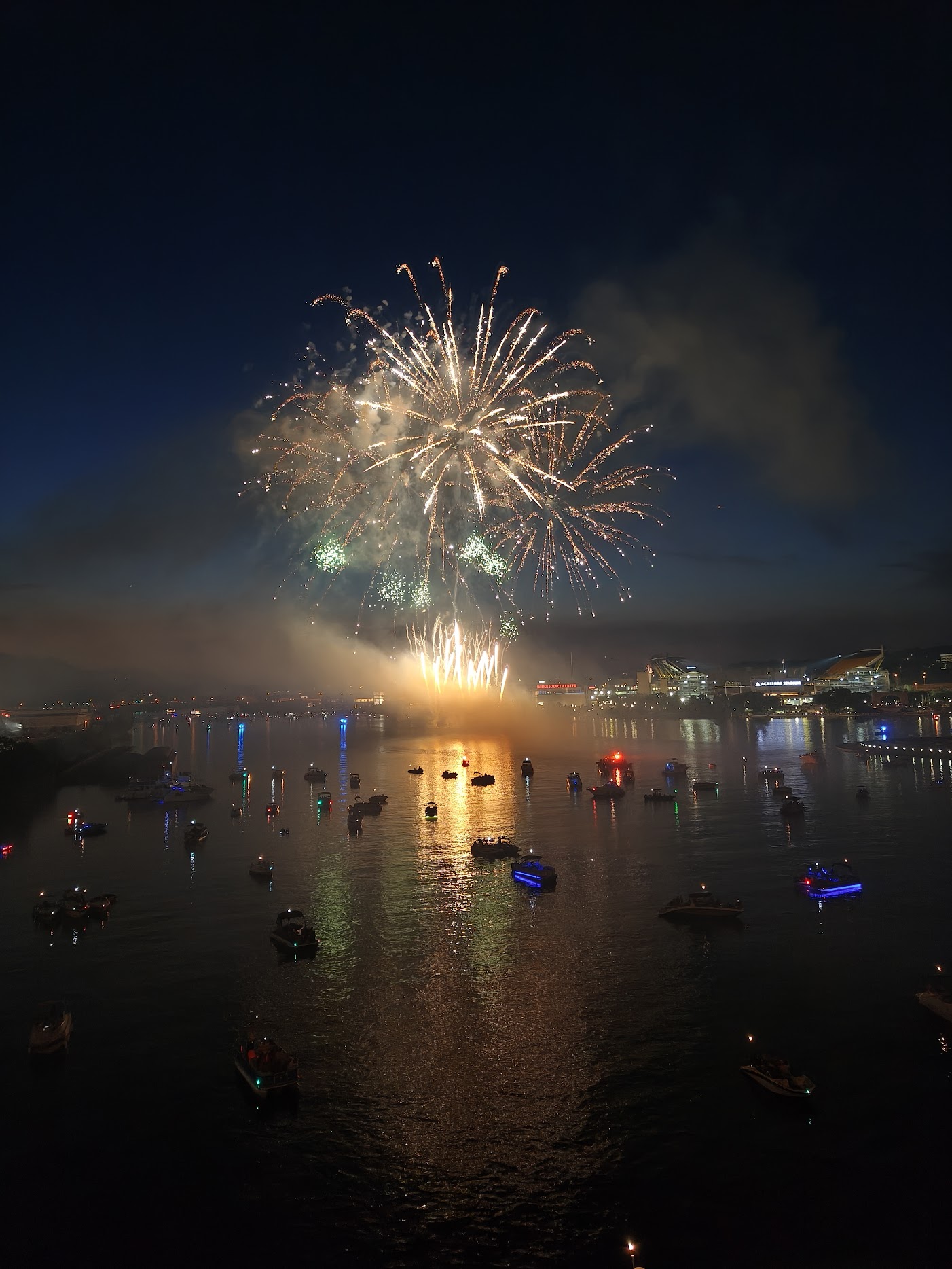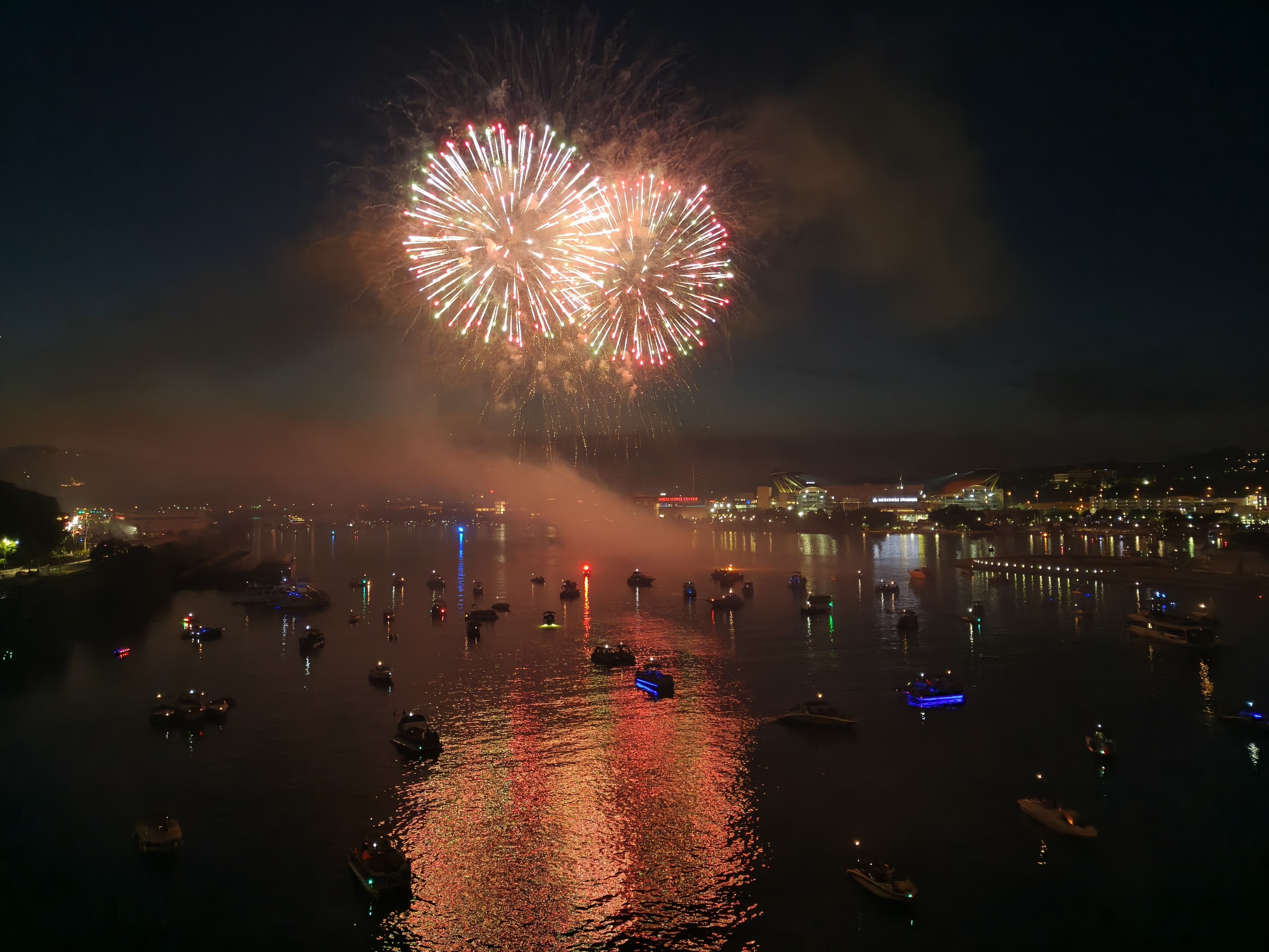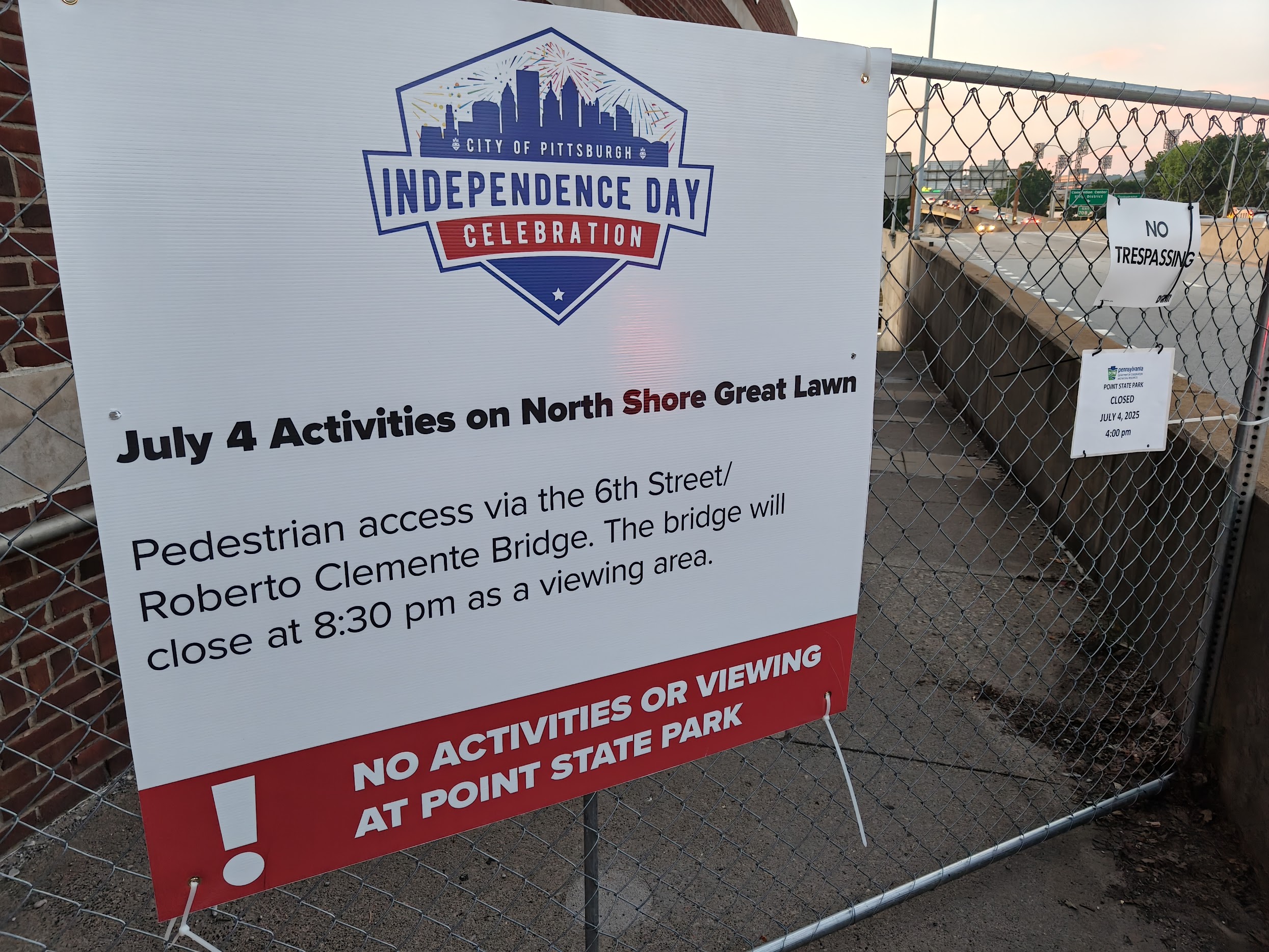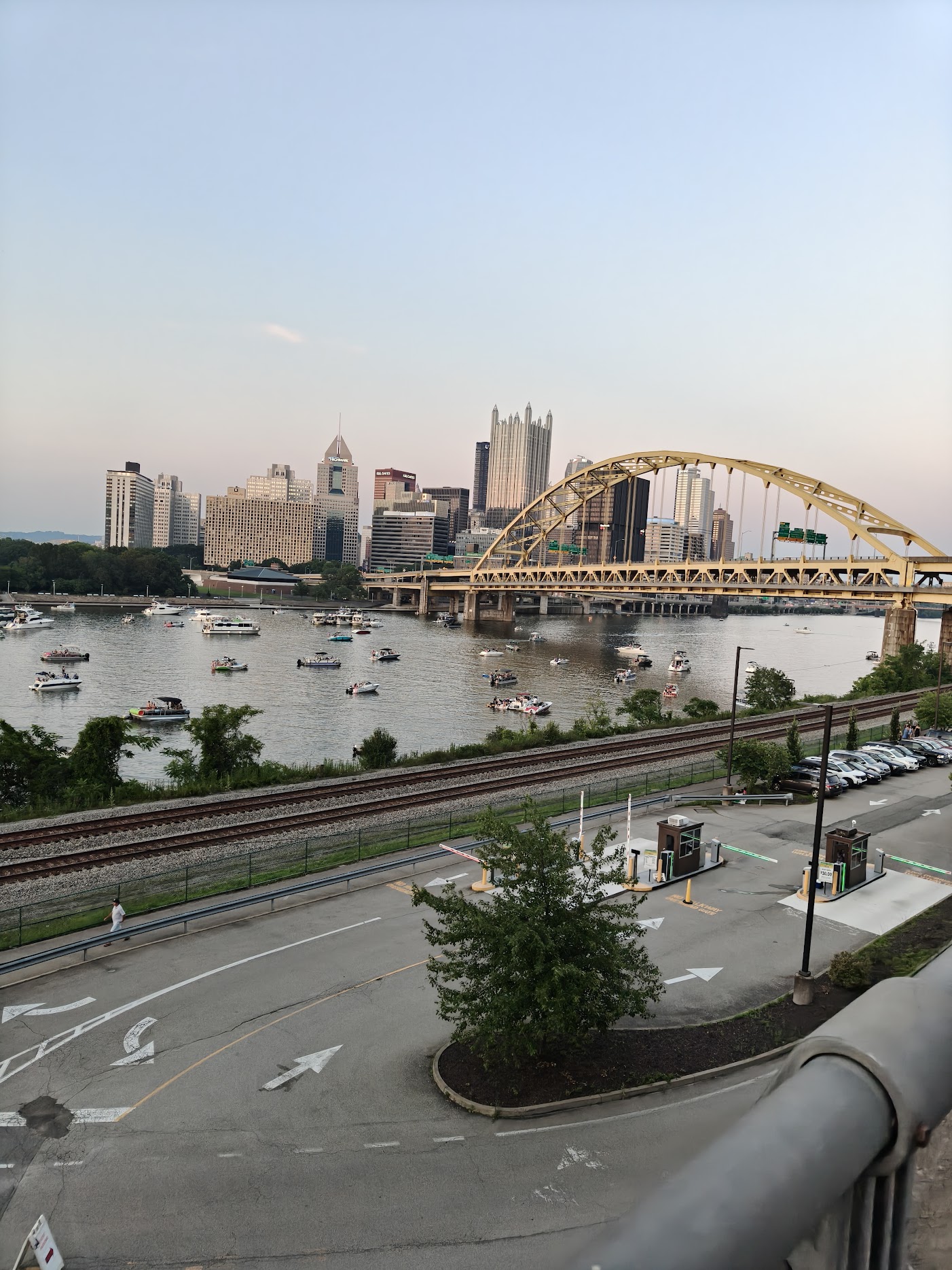 我们原计划步行返回市中心再前往PNC Park观看烟火,却发现来时大桥的人行道已被封闭,而反方向竟没有任何公交线路。整个市中心道路严重拥堵,连网约车也完全无法通行,无奈之下只得在原地等待烟火表演开始。其实大桥上观景的视野很不错,水面一览无遗,残念的是没有坐的地方。经过河畔步行、上山下山的一番折腾,感觉大腿已经麻木。就这样看着夕阳缓缓落下,待天空完全暗下来后烟火才会开始。